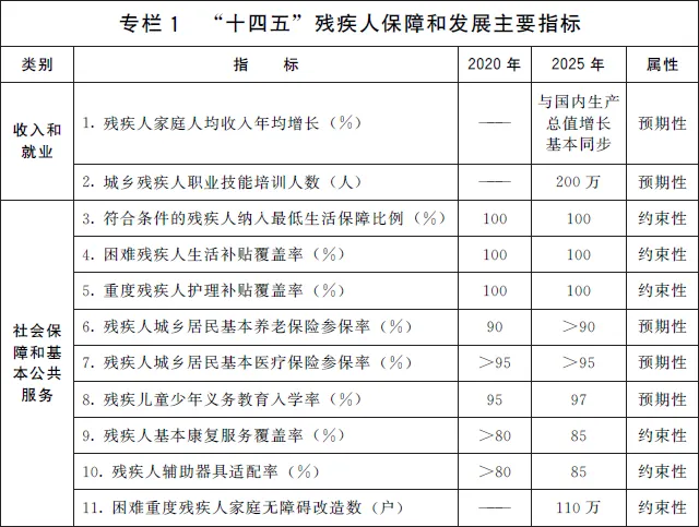 到2025年,残疾人脱贫攻坚成果巩固拓展,生活品质得到新改善,民生福祉达到新水平。多层次的残疾人社会保障制度基本建立,残疾人基本民生得到稳定保障,重度残疾人得到更好照护。多形式的残疾人就业支持体系基本形成,残疾人实现较为充分较高质量的就业。均等化的残疾人基本公共服务体系更加完备,残疾人思想道德素养、科学文化素质和身心健康水平明显提高。无障碍环境持续优化,残疾人在政治、经济、文化、社会、家庭生活等各方面平等权利得到更好实现。残疾人事业基础保障条件明显改善,质量效益不断提升。