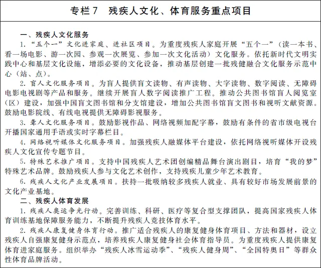 7.提升残疾人公共文化服务。鼓励残疾人参加“书香中国·阅读有我”等公共文化活动,持续开展“残疾人文化周”、“共享芬芳·共铸美好”等残疾人群众性文化艺术活动,推动基层创建一批残健融合文化服务示范中心(站、点),不断满足残疾人文化需求、增强残疾人精神力量。加强中西部和农村地区重度残疾人文化服务,为盲人、聋人提供无障碍文化服务。鼓励电视台、广播电台、网络视听媒体和融媒体中心开设残疾人专题节目。发展特殊艺术,鼓励残疾人参与文化艺术创作和非物质文化遗产传承,扶持残疾人题材图书等出版。扶持残疾人特殊艺术人才和师资培养。举办第十届、第十一届全国残疾人艺术汇演,举办国际特殊艺术交流活动。扶持中国残疾人艺术团和地方残疾人文艺小分队开展基层巡演。