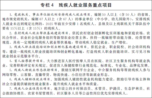 2.多渠道、多形式促进残疾人就业创业。开展残疾人就业促进专项行动。对正式招录(聘)残疾人的用人单位按规定给予岗位补贴、社会保险补贴、职业培训补贴、设施设备购置改造补贴、职业技能鉴定补贴等扶持,对超比例安排残疾人就业的用人单位给予奖励。规范残疾人按比例就业年审并实现全国联网认证。落实残疾人集中就业单位税费优惠、政府优先采购等扶持政策,稳定残疾人集中就业。支持非营利性残疾人集中就业机构持续发展。在经营场地、设施设备、社会保险补贴、金融信贷等方面扶持残疾人自主创业、灵活就业,鼓励残疾人通过新就业形态实现就业。加大对“阳光家园”、“残疾人之家”等辅助性就业机构的支持保障力度,组织智力、精神和重度肢体残疾人等就业更为困难的残疾人就近就便参加生产劳动、进行职业康复、实现社会融合。统筹现有公益性岗位,安排符合条件的残疾人就业。修订《盲人医疗按摩管理办法》,推动省级盲人按摩医院建设,制定盲人保健按摩有关标准,扶持和规范盲人按摩行业发展。拓宽残疾人特别是盲人在文化艺术、心理卫生和互联网服务等领域就业渠道。为残疾人特别是聋人参加职业技能培训、就业创业提供无障碍支持服务。支持手工制作等残疾妇女就业创业项目,鼓励残疾人参与文化产业。扶持残疾人亲属就业创业,实现零就业残疾人家庭至少有一人就业。