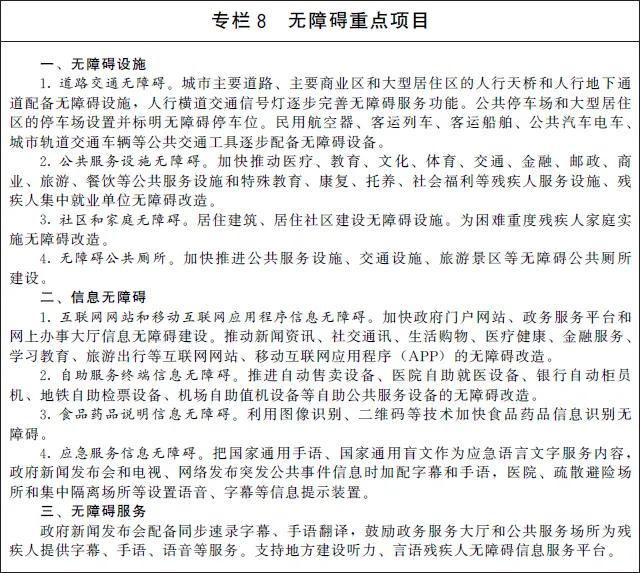4.加快发展信息无障碍。将信息无障碍作为数字社会、数字政府、智慧城市建设的重要组成部分,纳入文明城市测评指标。推广便利普惠的电信服务,加快政府政务、公共服务、电子商务、电子导航等信息无障碍建设,加快普及互联网网站、移动互联网应用程序和自助公共服务设备无障碍。推进智能化服务要适应残疾人需求,智能工具应当便于残疾人日常生活使用。促进信息无障碍国家标准推广应用,加强对互联网内容可访问性的测试、认证能力建设,开展互联网和移动互联网无障碍化评级评价。支持研发生产科技水平高、性价比优的信息无障碍终端产品。