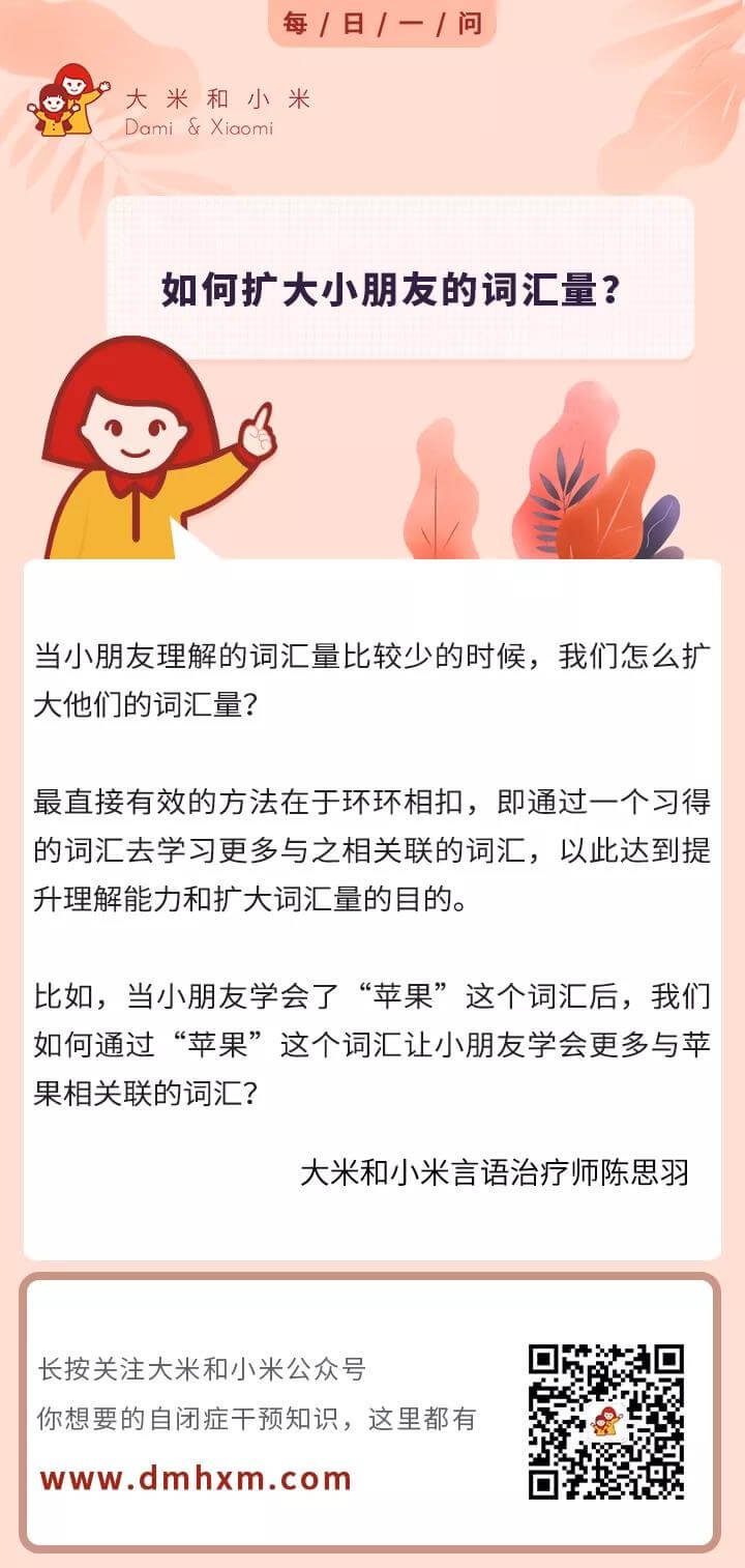 如何扩大小朋友的词汇量?当小朋友理解的词汇量比较少的时候,我们怎么扩大他们的词汇量?最直接有效的方法在于环环相扣,即通过一个习得的词汇去学习更多与之相关联的词汇,以此达到提升理解能力和扩大词汇量的目的。比如,当小朋友学会了“苹果”这个词汇后,我们如何通过“苹果”这个词汇让小朋友学会更多与苹果相关联的词汇?大米和小米言语康复师陈思羽