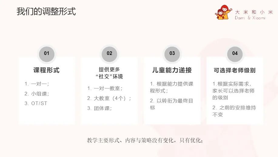 “要解决搭建社交阶梯、家校全情投入这两个核心问题,一个是调整课程体系,后一个是增设家长培训课程,教会家长熟练掌握干预技能,把孩子的有效干预时间由教室拓展至生活中的每时每刻......”王勇补充道。
