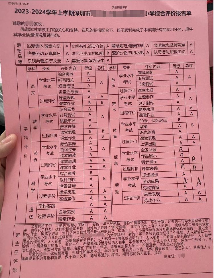 在老师的综合评价表上,杜宾拿到的也全是A和B。老师评价他“聪明有趣”“学习尚可”,也有“耐心和思考不足”、“自制力不强”等小毛病。