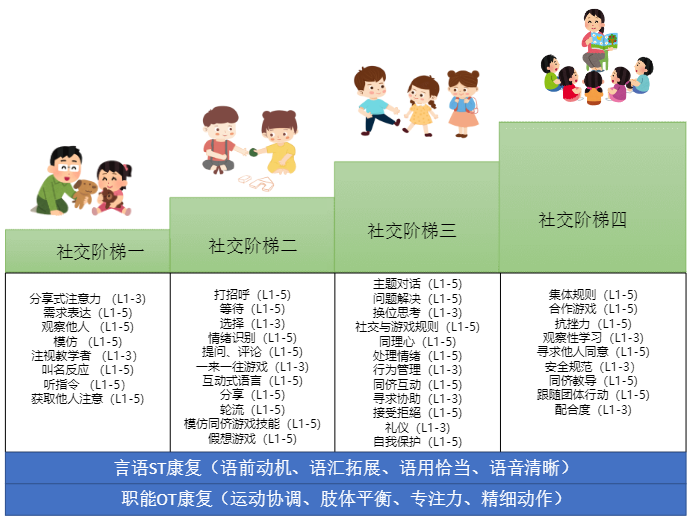 通过评估,陈靖督导发现尧尧的社交水平处于社交阶梯的初级阶段,甚至还不具备足够的进行社交的先备能力,如听指令、表达性沟通、模仿、游戏技能、眼神接触等。