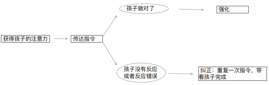 在发布指令前,我们要获得孩子的注意力,然后向孩子传达指令,如果他们做对了,我们便立即强化;如果孩子没有反应或者做错了,就及时提示。纠正的做法就是我们重新发一次指令,然后提示孩子做出正确的反应。
