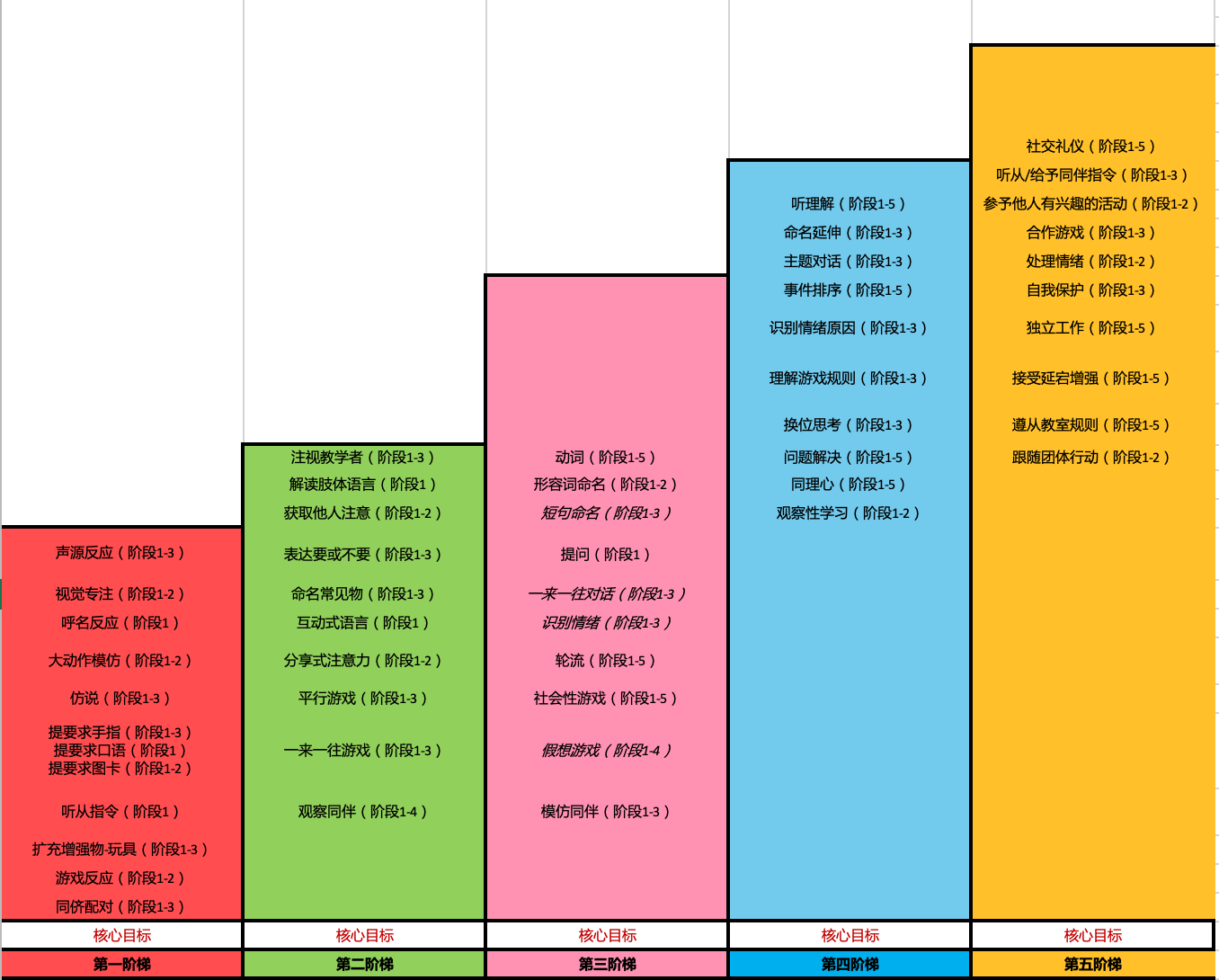 童童RICE社交阶梯的评估结果显示,她的能力尚处于第一阶梯(社交几乎为零,对人不关注,不会表达需求,不能完成一步模仿,不会命名……),因此,韩贻喜将她的短期干预目标定为提升安坐、听从指令、呼名反应、对人的关注等基础能力。