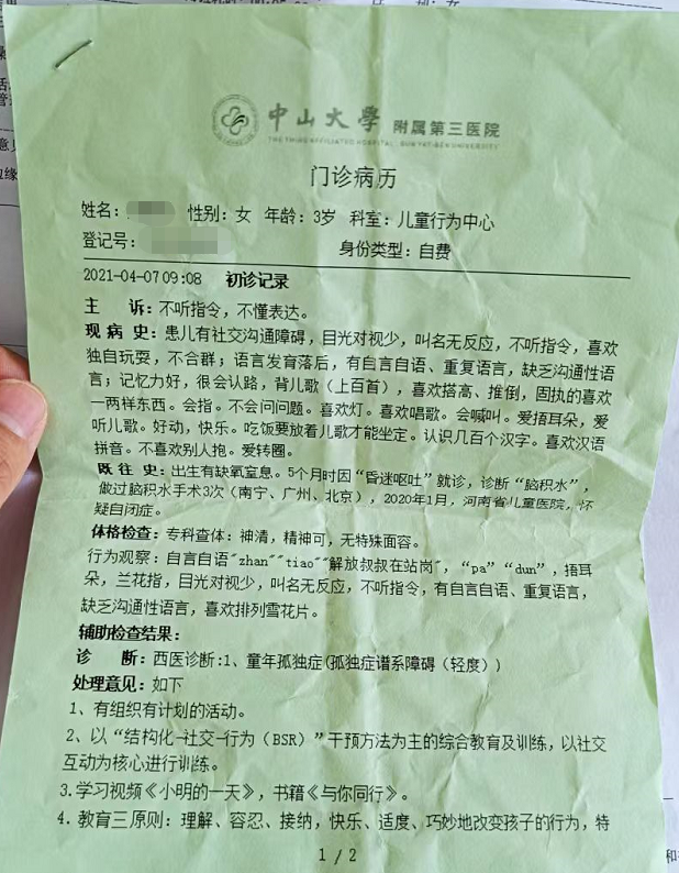同年4月,童童在广州中山三院被邹小兵教授诊断为自闭症。