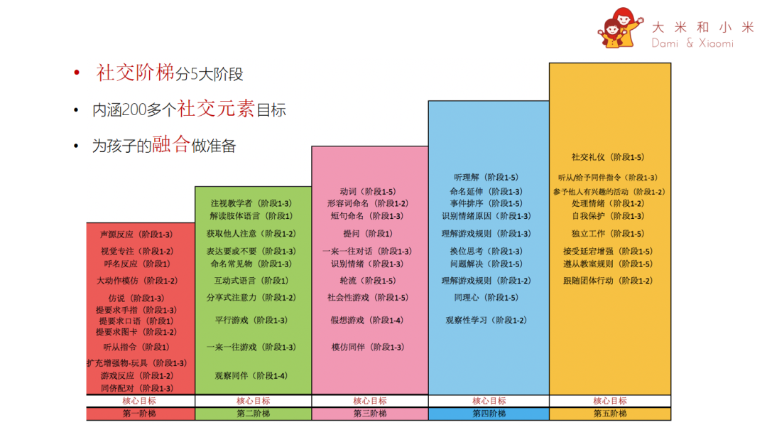 在大米和小米的RICE康复体系里,有BCBA-D袁巧玲博士和团队设计的一整套关于如何从简单到复杂,去提升自闭症谱系、发育迟缓儿童能力的社交阶梯。