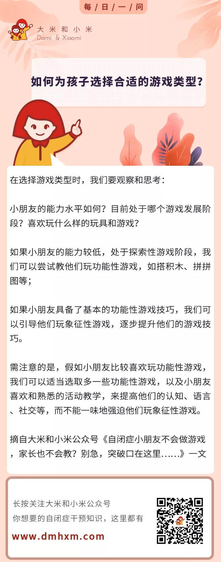 如何为孩子选择合适的游戏类型?在选择游戏类型时,我们要观察和思考:小朋友的能力水平如何?目前处于哪个游戏发展阶段?喜欢玩什么样的玩具和游戏?如果小朋友的能力较低,处于探索性游戏阶段,我们可以尝试教他们玩功能性游戏,如搭积木、拼拼图等;如果小朋友具备了基本的功能性游戏技巧,我们可以引导他们玩象征性游戏,逐步提升他们的游戏技巧。需注意的是,假如小朋友比较喜欢玩功能性游戏,我们可以适当选取多一些功能性游戏,以及小朋友喜欢和熟悉的活动教学,来提高他们的认知、语言社交等,而不能一味地强迫他们玩象征性游戏。摘自大米和小米公众号《自闭症小朋友不会做游戏家长也不会教?别急,突破口在这里......》一文
