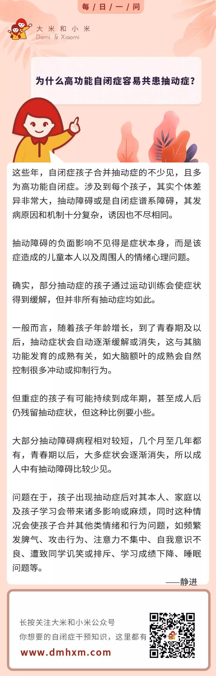 为什么高功能自闭症容易共患抽动症?这些年,自闭症孩子合并抽动症的不少见,且多为高功能自闭症。涉及到每个孩子,其实个体差异非常大,抽动障碍或是自闭症谱系障碍,其发病原因和机制十分复杂,诱因也不尽相同。抽动障碍的负面影响不见得是症状本身,而是该症造成的儿童本人以及周围人的情绪心理问题。确实,部分抽动症的孩子通过运动训练会使症状得到缓解,但并非所有抽动症均如此。一般而言,随着孩子年龄增长,到了青春期及以后,抽动症状会自动逐渐缓解或消失,这与其脑功能发育的成熟有关,如大脑额叶的成熟会自然控制很多冲动或抑制行为。但重症的孩子有可能持续到成年期,甚至成人后仍残留抽动症状,但这种比例要小些大部分抽动障碍病程相对较短,几个月至几年都有,青春期以后,大多症状会逐渐消失,所以成人中有抽动障碍比较少见。问题在于,孩子出现抽动症后对其本人、家庭以及孩子学习会带来诸多影响或麻烦,同时这种情况会使孩子合并其他类情绪和行为问题,如频繁发脾气、攻击行为、注意力不集中、自我意识不良、遭致同学讥笑或排斥、学习成绩下降、睡眠问题等。静进