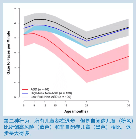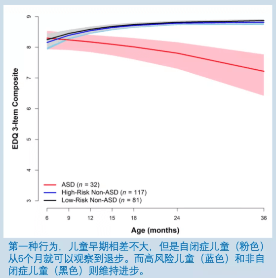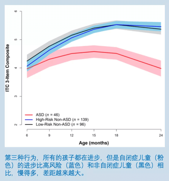 与回顾性研究不一样的是,她采用了前瞻性研究的方法来收集数据,从儿童刚刚出生就开始跟踪,在3岁左右确定有没有自闭症后,这些儿童可以分成三组:自闭症儿童,高风险儿童(即家里的哥哥或者姐姐有自闭症)和普通儿童。研究主要跟踪儿童的社交互动和社交交流,包括对视、相互亲近、社交发起和回应等。不同的行为,自闭症儿童与普通儿童的发育有着3种经历不同的轨迹。