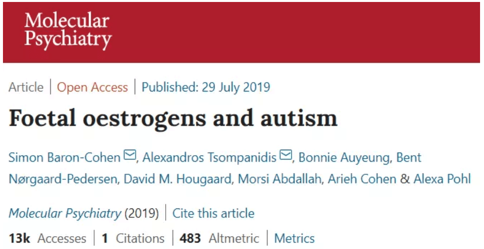 2019年7月份,Simon Baron-Cohen在《分子精神病学》(Molecular Psychiatry)杂志上,又发表了自己的最新研究成果《自闭症与性类固醇》发现产妇产前雌激素过多,自闭症患病风险可能增加50%。