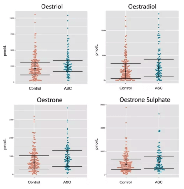 随后在2019年,他又公布了进一步的研究成果。他的研究结果表明,自闭症男性患者的产前雌二醇、雌三醇和雌酮的浓度水平升高均与自闭症有关,进一步扩展了自闭症中产前性类固醇生成活性升高的检验证据。