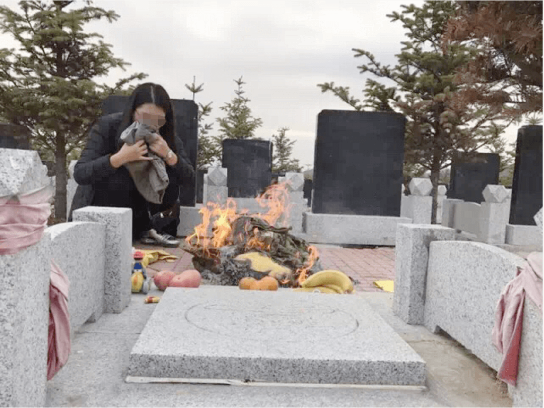 嘉嘉妈正在给嘉嘉烧他生前喜欢的衣服和玩具