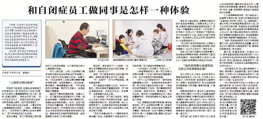 5月5日,中国青年报刊发自闭症人士羽飞在大米和小米四年的工作经历文章《和自闭症员工做同事是怎样一种体验》。