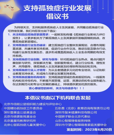 为持续关注、支持和服务孤独症人士及其家庭,共同推动孤独症行业可持续发展,发起组织共同向社会提出了《支持孤独症行业发展倡议书》。
