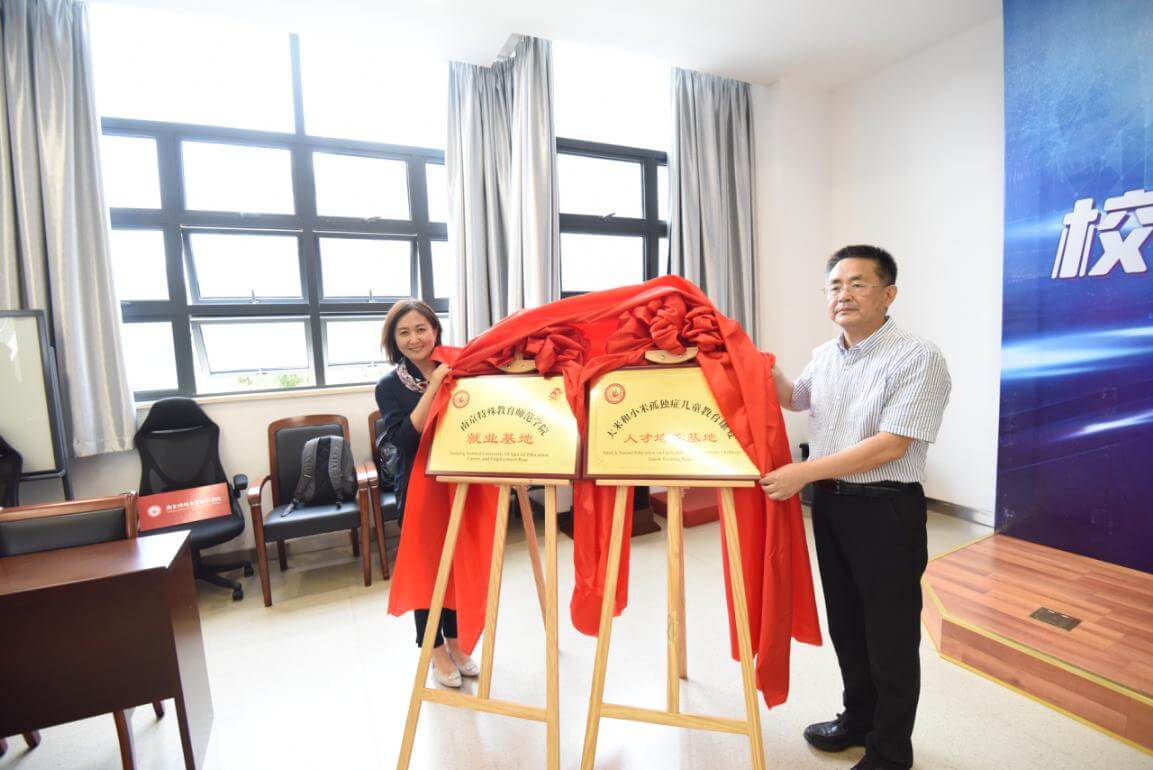 南京特师校长凌迎兵、大米和小米创始人姜英爽、大米和小米首席品牌官潘采夫、南京特师党委副书记王立新、南京特师副校长姜玉泉出席了签约仪式。姜英爽与凌迎兵为“南京特殊教育师范学院就业基地”、“大米和小米孤独症儿童教育康复人才培养基地”挂牌。