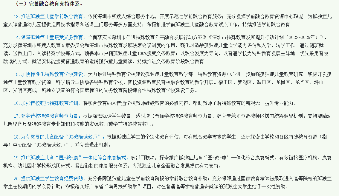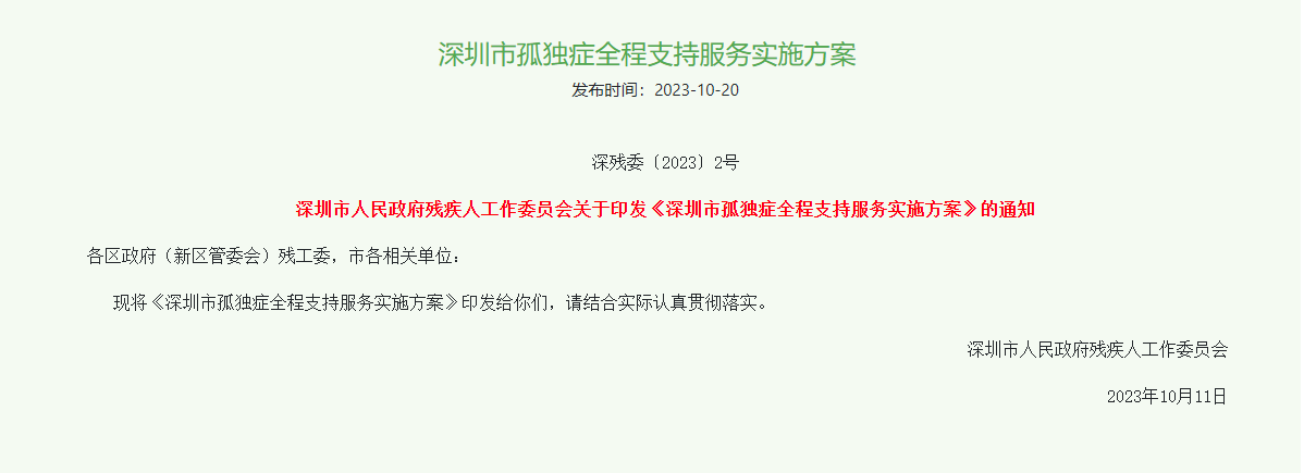 《深圳市孤独症全程支持服务实施方案》原文可见:深圳市孤独症全程支持服务实施方案 - 政策法规 - 深圳市残疾人联合会 (cjr.org.cn)