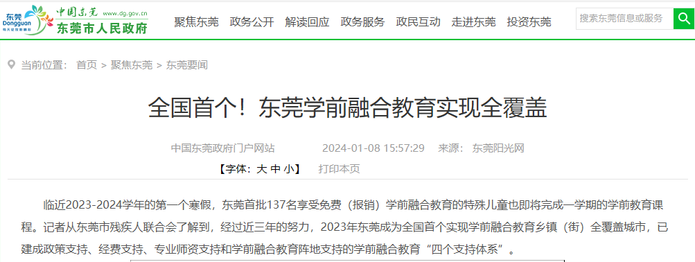 2023年7月,《东莞市残疾儿童少年接受教育资助实施细则》全面实施,提出东莞学前教育阶段残疾儿童在东莞公办幼儿园和民办学前融合教育推广幼儿园就读,可享受保教费免收或报销的权利,这项规定也正式标志着东莞成为全国首个实现学前融合教育乡镇(街)全覆盖城市。