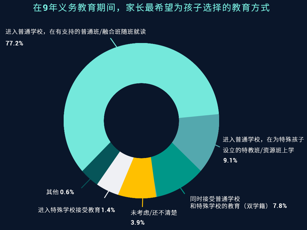 此外,在家长最希望孩子提升的能力层面,语言沟通能力(理解与表达)和社交规则(常规礼仪、参与)占比最高,分别为84.9%和79.6%。孤独症儿童家庭常住地主要分布在各康复机构中心所在城市,异地干预也多以附近省市为主,其中同城干预占比7成,家长更愿意选择离家近的专业机构进行干预康复,社区店成为未来趋势。在九年义务教育阶段,77.2%的家长期望孩子有机会进入普通学校,使孩子和正常学生一样有平等的机会共同发展。