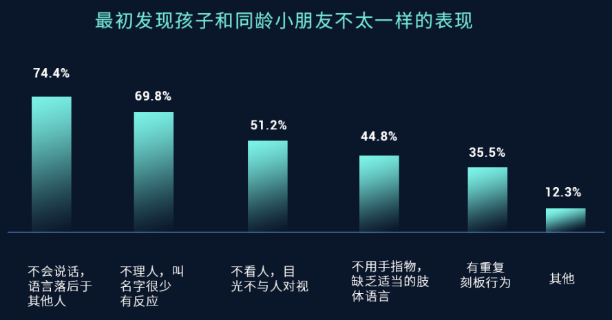 《报告》调查样本表明,孤独症儿童性别差别比例较大,其中,孤独症男孩占比82.6%,而孤独症女孩占比17.4%。调查发现,大多数孤独症儿童的父母在孩子出生后的第二年(平均年龄是21个月)就已经察觉到他们的异常,“不(少)看”、“不(少)应”、“不(少)指”、“不(少)语”、“不当”是5大早期表现行为,其中“不应”、“不语”是多数孤独症儿童的早期表现。